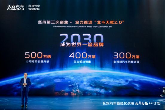 面向未来,长安汽车始终坚持第三次创业——创新创业计划,全力推进“北斗天枢2.0”计划,力争到2030年,公司总体销量突破500万辆,其中,自主板块销量400万辆,数智新汽车销量突破300万辆,成为世界级品牌。