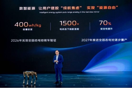 在数智能源方面,发布会现场由机器狗“来福”带来了——长安金钟罩全固态电池。这款全固态电池,能量密度可达400wh/kg,满电状态下续航里程将超过1500公里,还可通过AI远程诊断,使安全性提升70%,预计年底前实现固态电池的功能样车首发;2026年实现固态电池装车验证;2027年,推进全固态电池逐步量产。