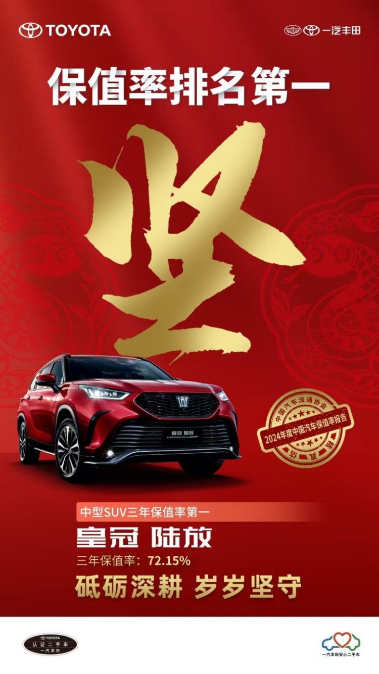 时光焕新计划的底层逻辑是一汽丰田构建的行业领先保值体系,在近三年行业评选中,一汽丰田品牌保值率较行业均值高出4个百分点以上,在中国汽车流通协会《2024年度中国汽车保值率报告》中,一汽丰田SUV家族包揽细分市场保值率冠军,其中皇冠陆放三年保值率高达72.15%,这种长期价值管理能力源自三大支柱。