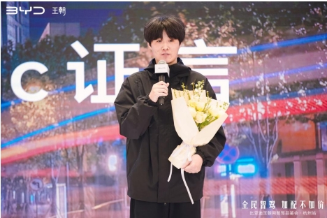 新车主交付,见证智驾新征程:活动中最令人瞩目的环节是新车主交付仪式。几位新车主代表在众人的见证下,从广成比亚迪汽车王朝网 品牌总——周全先生手中接过了交车花束及交车礼品,正式开启了他们的智驾新生活。这一刻不仅是对比亚迪王朝智驾车型市场认可的有力证明,更是对比亚迪持续引领汽车行业智能化变革的美好期许。