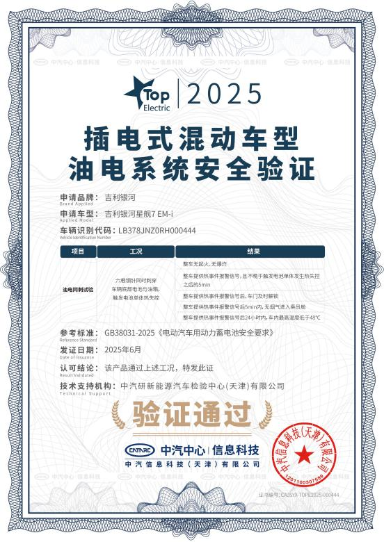6月24日,吉利银河星舰7 EM-i作为001号测试车辆,在中汽研汽车检验中心,顺利通过行业首次动力电池新国标插混车型电池、油箱同步穿刺试验,并获颁中汽中心行业首个插电式混动车型油电系统安全验证,进一步验证搭载吉利神盾电池安全系统的吉利银河星舰7EM-i远超标准的全方位安全冗余。