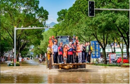 屋顶排水管采用304不锈钢焊接,全厂排水口高于周边河道百年一遇水位0.5米,地面海绵式排水设施严格控制植被、碎石厚度,加速积水疏导……一系列设计让吉利临海工厂可以有效应对洪涝灾害。2019 年,在16级台风利奇马袭击下,工厂凭借硬核的防涝工程、严密快速的2小时应急机制,实现厂区零伤亡,还第一时间成立专项救援小组,前往临海市区对发生暴雨洪涝地方进行现场救援。