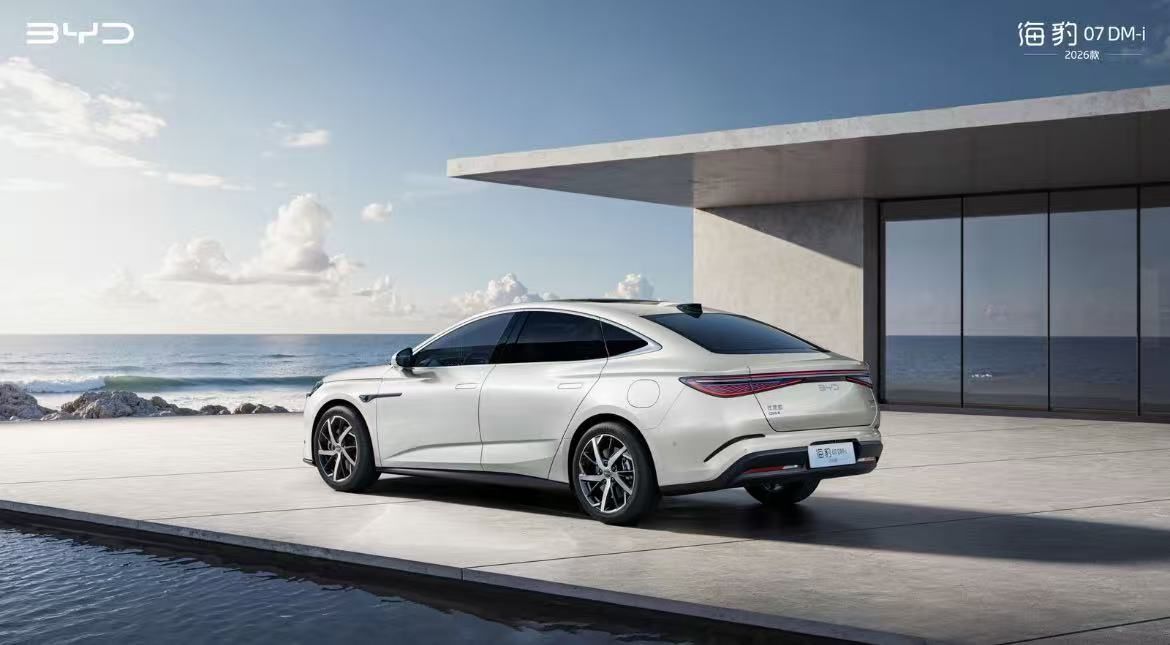 2026款海豹07DM-i 完美传承海洋网家族设计语言,将自然韵律与科技质感深度融合。前脸采用 “驭风斩浪” 造型,三条横向饰条构成的 “海浪无界格栅”呈“八”字形展开,搭配封闭式 EV 前脸,视觉上拉宽车身比例的同时彰显新能源身份。溜背式车顶线条从B柱顺滑延伸至车尾,与后备厢扰流板形成灵动夹角,配合海韵双侧腰线,将运动气息与优雅气质完美平衡。