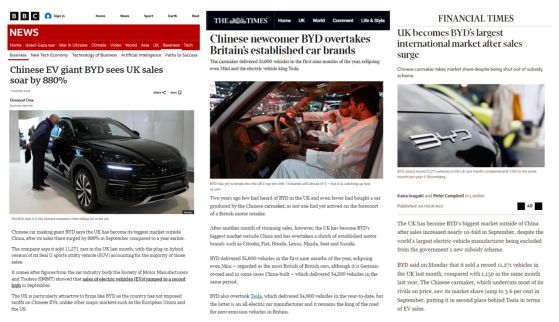 比亚迪在英国市场的高速增长,也吸引了英国主流媒体的高度关注。英国广播公司(BBC)报道“中国电动汽车巨头比亚迪9月英国销量创下新高”;《泰晤士报》则以“中国新晋品牌比亚迪超越英国老牌汽车品牌”为题,指出“两年前英国几乎没人听说过比亚迪”;《金融时报》更进一步强调“英国成为比亚迪最大的国际市场”。