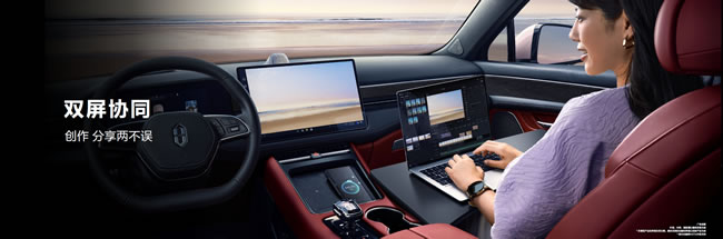 此外,问界M5 EV还新增了双屏协同9和手机协同功能,电脑可以便捷地与车机互联;手机日程、导航等信息自动同步至车机,甚至在地库等信号不好的位置能够共享网络给车机。