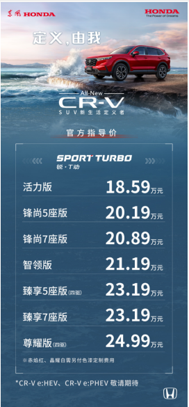 “定义,由我”,超越期待。9月28日,“SUV新生活定义者”——东风Honda全新一代CR-V正式上市。首发全新一代CR-VSPORT TURBO锐·T动,官方指导价为18.59万元-24.99万元。