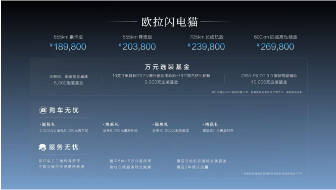 本次发布会,欧拉闪电猫公布四款车型,分别为600km四驱高性能版,综合补贴后售价26.98万元;705km长续航版,综合补贴后售价23.98万元;555km尊贵版,综合补贴后售价20.38万元;续航555km豪华版,综合补贴后售价18.98万元。此外还包含“无忧购车”、“无忧用车”、“选装折扣”三重惊喜上市权益。诚意十足的价格,让更多的年轻人、家庭用户都可以享受到闪电猫带来的惊艳之旅。