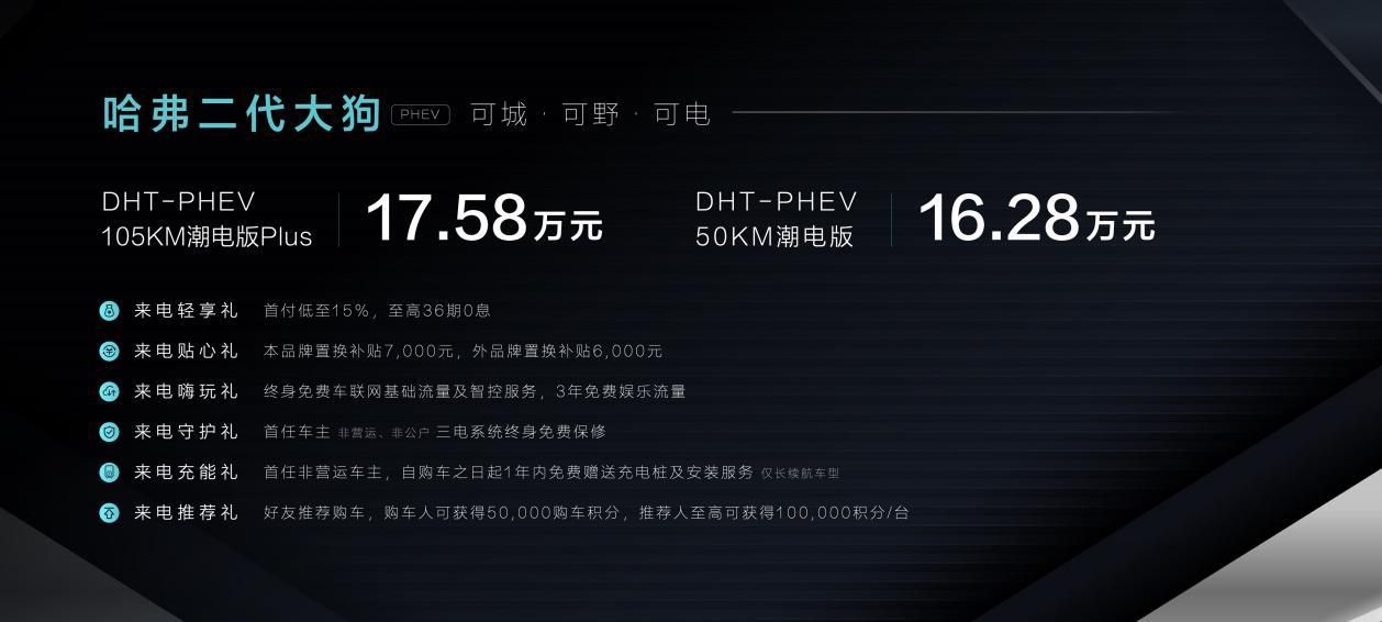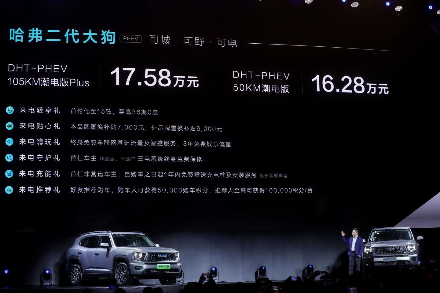 将宠粉进行到底,哈弗二代大狗为用户精心定制了来电六重礼遇——来电轻享礼首付低至15%,至高36期0息;来电贴心礼本品牌置换补贴7000元,外品牌置换补贴6000元;来电嗨玩礼终身免费车联网基础流量及智控服务,3年免费娱乐流量;来电守护礼首任车主(非营运、非公户)三电系统终身免费保修;来电充能礼首任非营运车主,自购车之日起1年内免费赠送充电桩及安装服务(仅长续航车型);来电推荐礼好友推荐购车,购车人可获得50000购车积分,推荐人至高可获得100000积分/台。