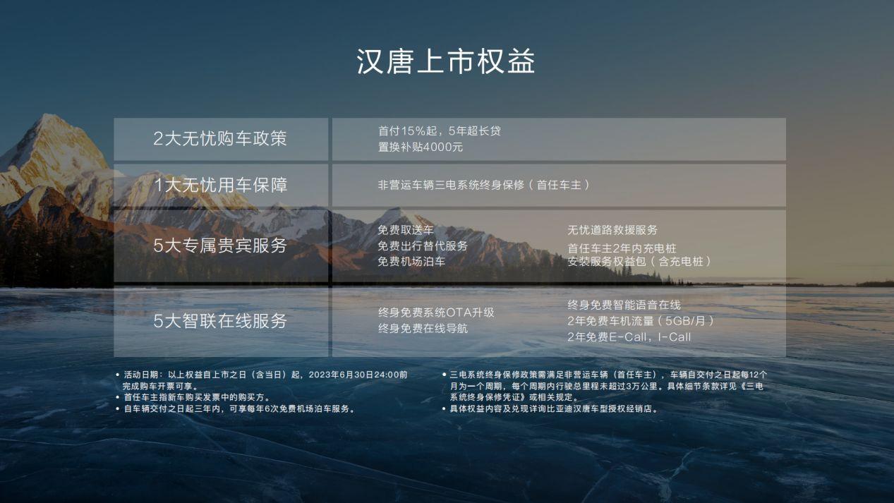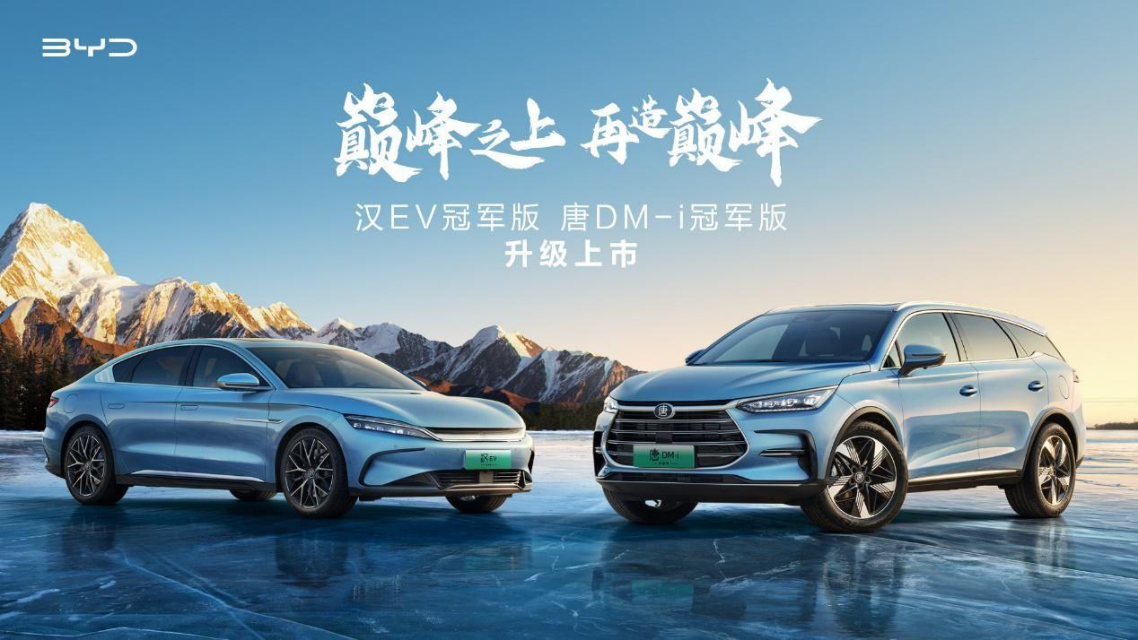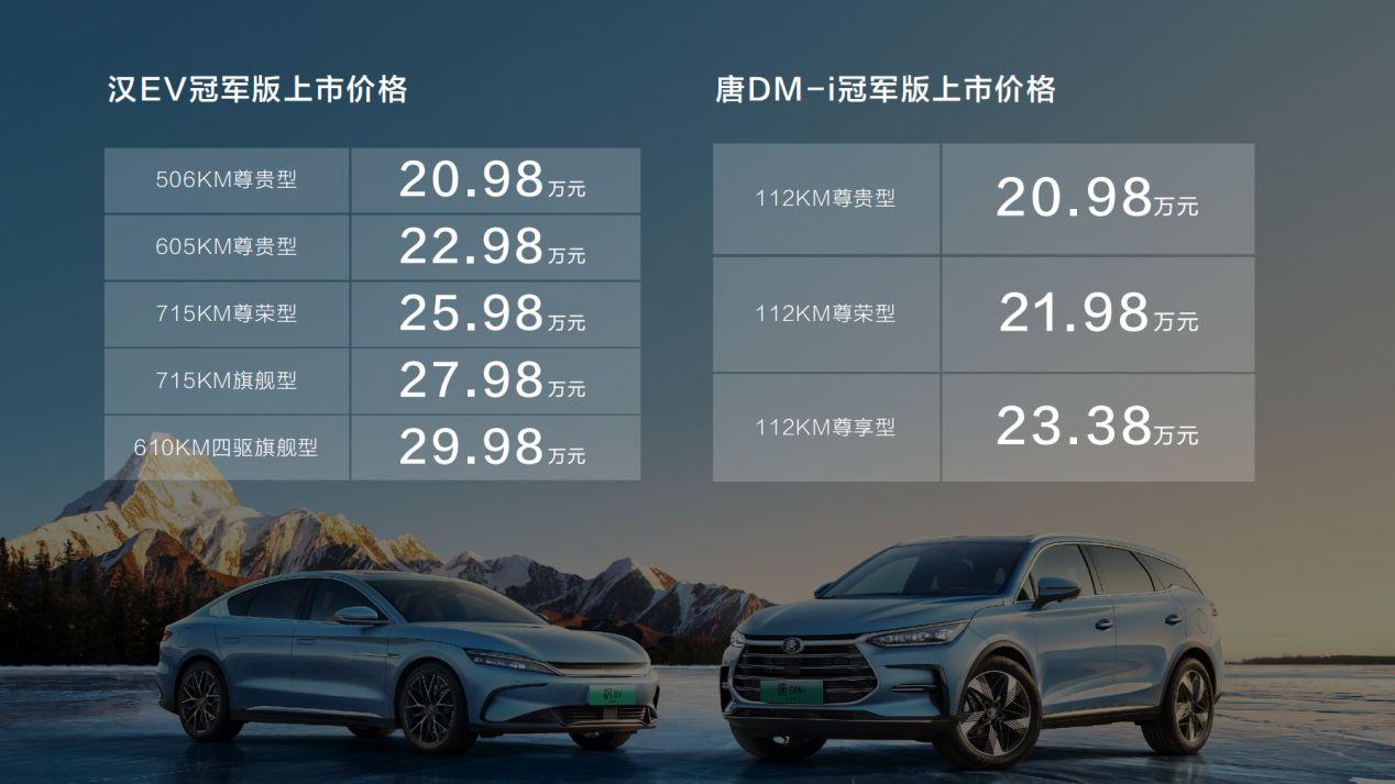 其中,汉EV冠军版建议零售价为20.98~29.98万元,唐DM-i冠军版建议零售价为20.98~23.38万元,同时两款车型为用户准备了2大无忧购车政策、1大无忧用车保障、5大专属贵宾服务、5大智联在线服务等多重购车礼遇。