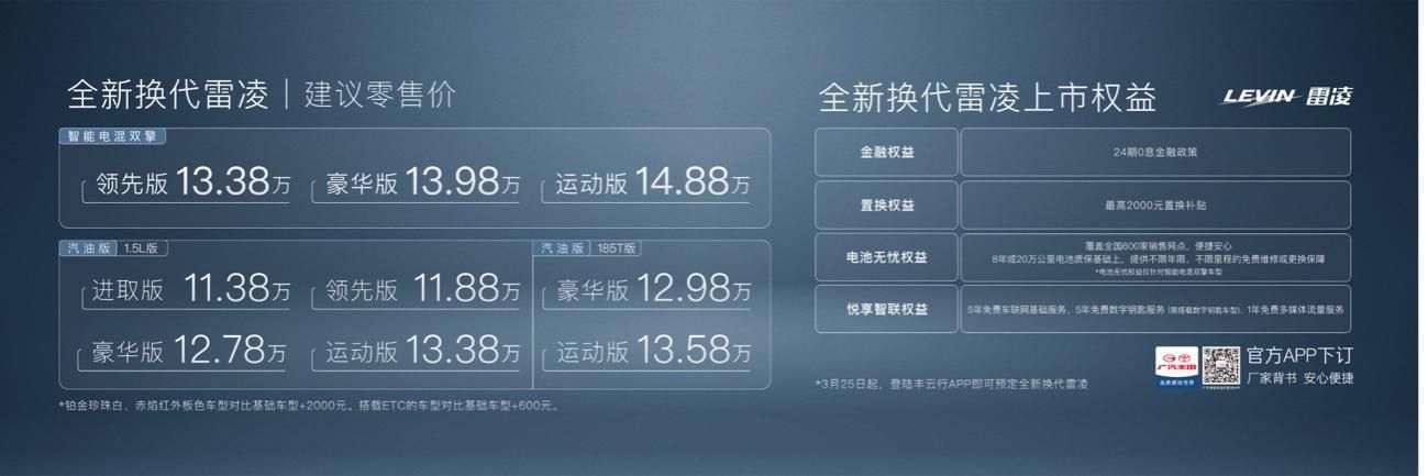 (2023年3月23日,成都)电混先锋,刷新未来!备受期待的丰田第五代智能电混双擎中国首车--广汽丰田全新换代雷凌正式上市。这是广汽丰田站在年产销百万台新起点,向全面电动化、智能化阔步迈进的最新力作,强势开启智能电混新时代。此次新车发布,除智能电混双擎外,还同步推出TNGA 1.5L和185T共三大动力系列,提供多样化、高价值产品选择,全面覆盖用户需求,全系列产品厂商建议零售价为11.38万元-14.88万元。同时,还为用户提供了一系列诚意十足的超享权益。