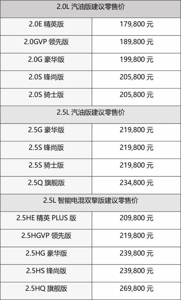 2022年6月,新增2.0S骑士版、2.5S骑士版,进一步拓展年轻消费者的多元的外观选择。同时,还新增智能电混双擎精英PLUS版,丰富了智能电混双擎车型的配置级别选择,智能电混双擎车型售价首次降到21万元内,为市场提供了更触手可及的电混车型选择。