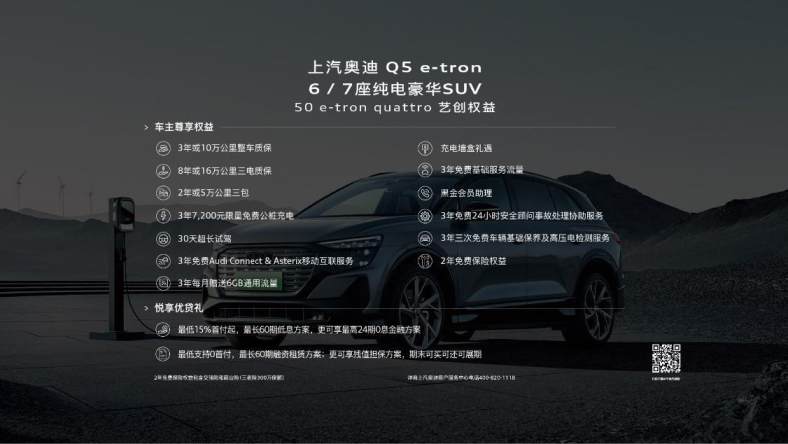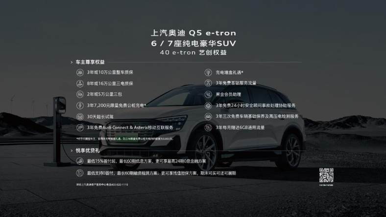 基于“用户为先”的品牌理念,上汽奥迪为每一位购买奥迪 Q5 e-tron的车主提供“一价全包”式的尊享权益,覆盖从购车开始到保养、充电、保险、流量、出行等用车生命周期的全场景需求,用户无需额外支付费用便能享受 "0负担" 的豪华电动出行体验。消费者现可登录上汽奥迪官方App,订购2023款奥迪 Q5 e-tron车型。