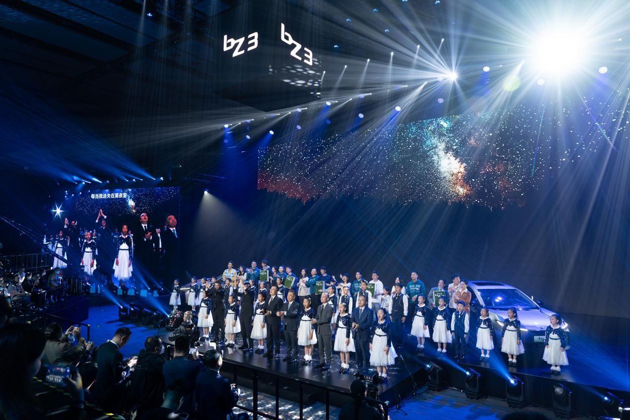 在发布会尾声,童声合唱团与5组家庭、bZ专员、现场媒体共同合唱了《夜空中最亮的星》,一汽丰田汽车销售有限公司总经理董修惠、一汽丰田销售公司常务副总经理清水卓治、一汽丰田汽车销售有限公司副总经理王林虎、一汽丰田bZ3总设计师加藤武郎和他的设计师团队牵着小朋友的手一同上台,在“合家欢”的温馨氛围中,为整场发布会画上了圆满的句号。