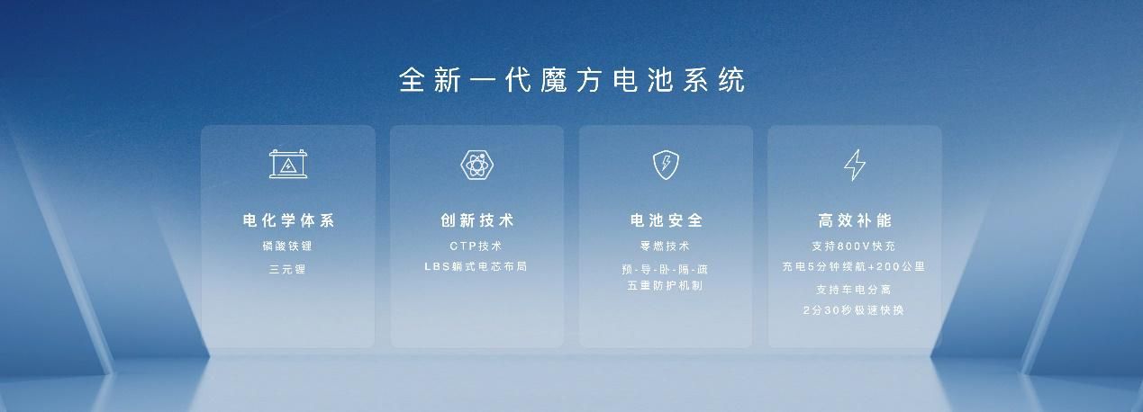 作为行业领先的动力储能解决方案,全新一代魔方电池系统支持磷酸铁锂、三元锂等多种电化学体系。其采用高效安全的CTP技术、创新的LBS躺式电芯布局,还应用零燃技术,通过五重防护机制,为用户构筑坚固的安全防线。全新一代魔方电池系统还兼容领先的补能技术,可支持800V快充,充电5分钟,续航可增加200公里,还支持最快仅需2分30秒的极速换电。