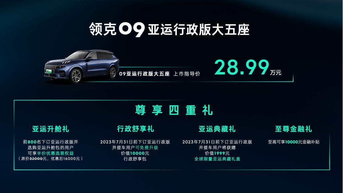 领克09大五座在空间、驾控、舒适、安全和智能上的完美兼顾,让用户对30万级大五座旗舰SUV“价值天花板”有了全新的认知。为携手用户启航全新征程,领克09大五座为首批预订并提车的用户带来四重尊享权益——亚运升舱礼、行政舒享礼、亚运典藏礼与至尊金融礼。