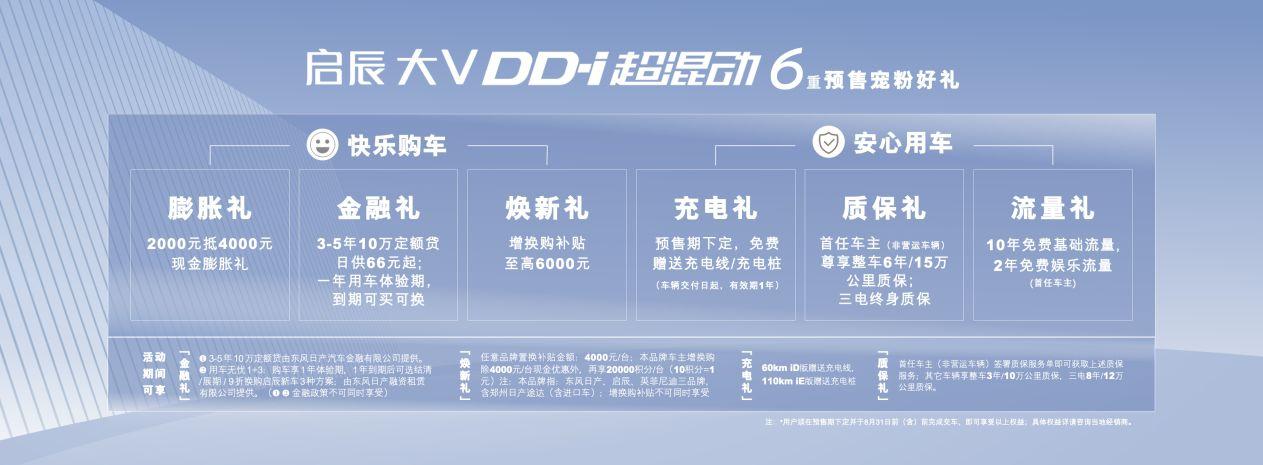 同时,为给用户带来贴心的购车体验,东风日产新能源启辰大V DD-i 超混动带来宠粉6重好礼,膨胀礼、金融礼、焕新礼、充电礼、质保礼、流量礼,从快乐购车、到安心用车两大方面提供无忧的礼遇政策。