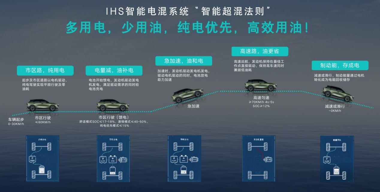 搭载IHS智能电混系统,超混动大V遵循“多用电,少用油,纯电优先,高效用油”的智能超混法则,可以根据实际工况智能调节驱动方式。在实际驾驶过程中,无需用户手动切换模式,系统可根据车速、电池SOC状态以及需求功率自动切换纯电驱动、串联充电、串联放电、发动机直驱以及能量回收五大智能工况模式。无论是城市路况还是高速路况,超混动大V都能自主切换轻松适应,时刻让车辆保持在最佳工作区域,通过这样一套智能电混系统,达到节能的效果,做到不省动力,只省油。