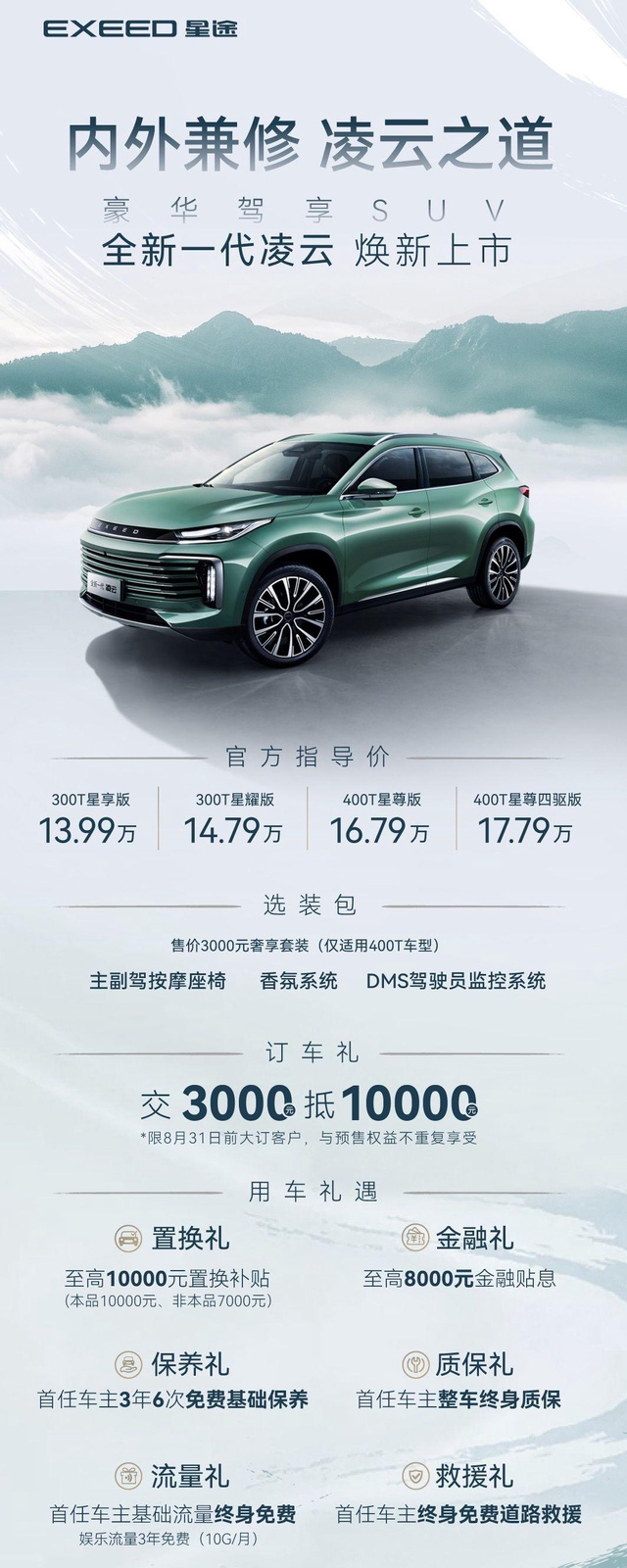 【2023年7月24日】奇瑞高端品牌星途2.0时代的焕新力作——全新一代凌云重磅上市。新车定位“豪华驾享SUV”,共推出4款车型,售价区间13.99万元-17.79万元。为感恩用户对星途品牌的支持与信赖,全新一代凌云还为用户提供了从买车到用车一条龙服务:8月31日前购车可享交3000元抵10000元大订礼(与预售权益不重复享受),首任车主可享四大终身保障,包括终身免费基础流量、终身免费道路救援、整车终身质保以及3年6次免费基础保养(含首保)。此外,购买全新一代星途凌云还可享至高置换补贴10000元和至高8000元金融贴息礼遇。多重钜惠福利加持,真正做到宠粉到家。