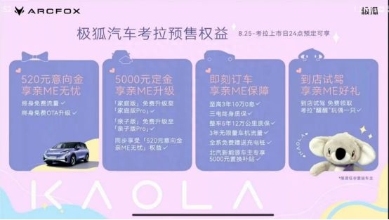 公布预售价格之外,极狐汽车考拉还释放了限时预售专享好礼。在限时预售期间预订的用户,可享最高3年10万0息贷款、三电终身质保、整车5年12万公里质保、3年无限量车机流量、全系免费赠送充电桩、北汽新能源车主专享5000元置换补贴用车保障等超值福利;支付520元意向金,叠加享受终身免费流量和终身免费OTA升级出行无忧;支付5000元定金,在意向金基础上叠加享受车型版本免费升级,进阶高配,体验提升;预售期到店试驾,可收获考拉玩偶“醒醒”一只。考拉用一种福利进化论的方式,保证了这台车的后勤基础,再配有越级的产品力,不得不说极狐汽车考拉确实很有诚意。