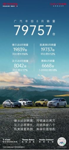 广汽丰田三大旗舰车型在今年8月持续发力,其中赛那8月销量6668台,1-8月同比增长8%,汉兰达8月销量8042台,三大旗舰车型占比8月总销量43%,广汽丰田高端车型消费者认可度持续增长。可以说,广汽丰田全面高端化战略初步得到了市场和消费者的认可。