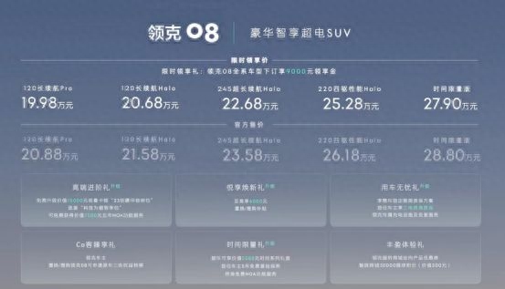 【9月8日,北京】9月8日,豪华智享超电SUV领克08于北京正式上市,本次共推出5款车型:120长续航Pro售价20.88万元、120长续航Halo售价21.58万元、245超长续航Halo售价23.58万元、220四驱性能Halo售价26.18万元、时间限量版28.80万元。