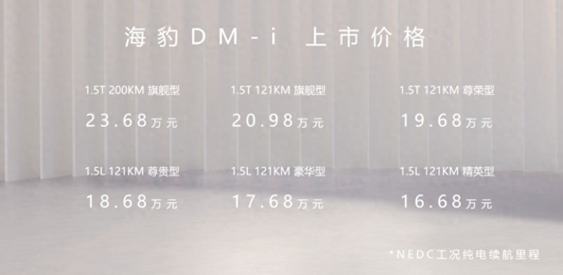 据悉,海豹DM-i共有6款车型越级上市,官方指导价为16.68万-23.68万元,并为用户准备了2年0息、5000元置换补贴;赠送6年或6次基础保养(含首保);首任车主非营运车辆三电终身保修等多重上市礼遇,可谓诚意满满。