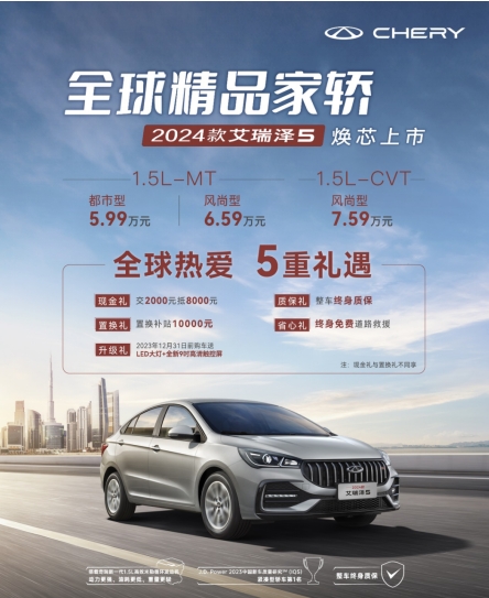 畅销全球80多个国家和地区、斩获全球100万用户的艾瑞泽5,再次焕新,产品进阶。10月20日,2024款艾瑞泽5焕芯上市,共推出1.5L-MT、1.5L-CVT三款车型,市场指导价区间为5.99万元-7.59万元。新车定位“全球精品家轿”,造型、动力、配置全面升级,以超高性价比成为全球用户入门家轿首选。不仅产品竞争力全面提升,2024款艾瑞泽5还为用户带来五重礼遇,刚需可直接入手。 ①现金礼:交2000元抵8000元 ②置换礼:置换补贴10000元 ③质保礼:整车终身质保 ④升级礼:2023年12月31日前购车送LED大灯+9吋高清大屏 ⑤省心礼:终身免费道路救援 注:现金礼与置换礼不同享 全球精品家轿,收获全球百万用户信赖 作为奇瑞年轻化战略转型的首款车型,艾瑞泽5问世七年,始终秉持德系“理工”精神和“工程师”思维造车,成为中国品牌畅销全球的家轿标杆。同时,艾瑞泽5是中国品牌第一款敢以世界级标准进行打造的车型,也是第一个运用全球资源、全球标准打造的一款全球车,近期更是荣获J.D.