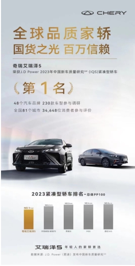 2023年中国新车质量紧凑型轿车第1名,用最强品质赢下中国品牌轿车最高荣耀。同时,艾瑞泽5二手车保值率高达46.49%,荣膺J.D.