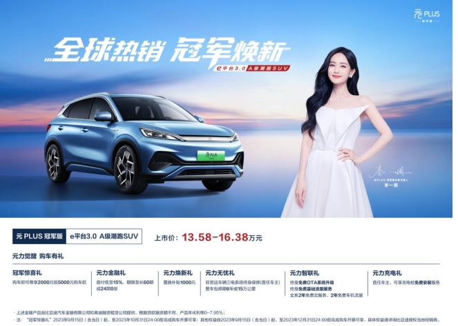 4.0智能网联系统配合15.6英寸8核自适应旋转悬浮Pad,畅享百万应用、自由定义爱好;VTOL移动电站功能让生活随时来电,野炊、露营通通实现;大师级NVH静谧空间、手机无线充电等功能,让智能便捷生活如影随形。 实力领先,鉴证四大进阶 倾听全球用户的心声,通过更精准的场景化开发,元PLUS冠军版还实现了颜值焕新、内饰焕新、舒享升级、智能进阶,给元力青年、元气女生、活力家庭带来高品质驾乘体验,进一步引领A级纯电SUV价值进阶。 颜值焕新,驭鉴酷炫潮跑:内饰焕新,元气活力盛放:舒享升级,惬享智慧生活:智能进阶,行车安全加倍。 驭鉴A级潮跑,再掀潮流趋势,全球明星元PLUS冠军版的上市,为杭州迪粉们带来了更多用车选择,在发布会上,公布了元PLUS冠军版的官方售价13.58万元~16.38万元,并提供多重优惠购车礼遇。特别是冠军惊喜礼10月31日前购车即可享受2000抵5000的超级福利。 据悉元PLUS冠军版车型目前已陆续到店,大家可到比亚迪杭州王朝网经销店试驾、体验。以冠军品质,传递中国实力!