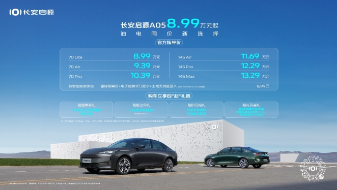 10月20日,“数智启源 美好跃迁”长安启源数智密码活动在上海精彩举行。油电同价新选择,数智电驱超省新家轿,长安启源A05在全网观众见证下全域上市。6款车型配置、价格正式公布。三款70km纯电续航车型售价为70 Lite款8.99万元,70 Air款9.39万元,70 Pro款10.39万元。三款145km纯电续航车型,售价为145 Air款11.69万元,145 Pro款12.29万元,145 Max款13.29万元