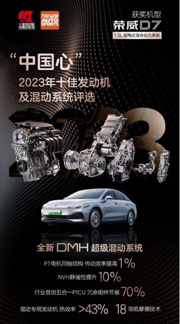 除了市场端反应热烈,行业端荣威D7凭借核心技术拿下数项行业权威大奖,以冠军实力重塑B级车市场竞争格局。作为首款落地应用DMH超级混动系统的旗舰车型,荣威D7 DMH集成了上汽在插电混动技术领域十余年技术优势,在2023混合动力汽车极限挑战赛上,拿下中大型插电式混合动力轿车组、亏电油耗全车型双料冠军之后,再次于近日举办的“中国心”2023年度十佳发动机及混动系统评选活动中,荣获“中国心”2023年度十佳发动机及混动系统称号。