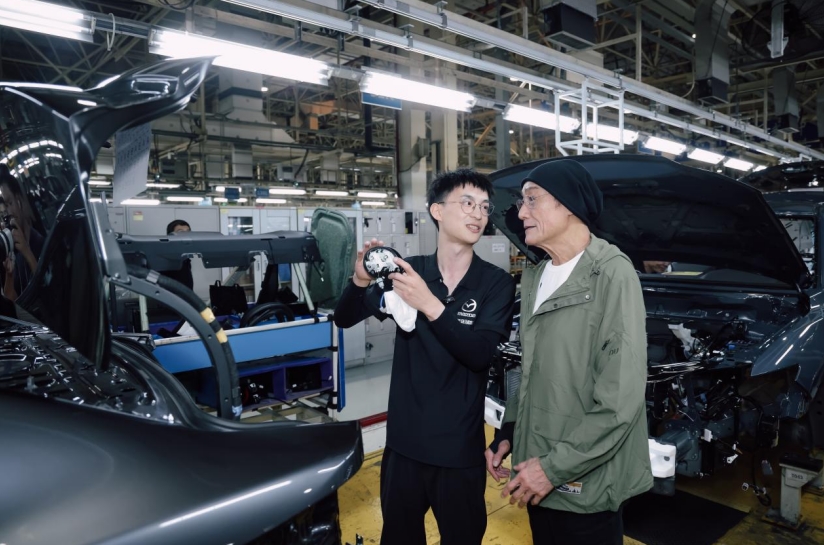 CX-50行也产品代言人、“千面影帝”梁家辉首次走进汽车生产线,零距离见证了CX-50行也HEV的生产全过程,并给予长安马自达南京工厂高度评价:“造一辆好车就像拍一部好电影,都需要严谨认真的态度,和一颗极致的匠心”。长安马自达南京工厂作为马自达海外最佳工厂,拥有强大的制造实力:冲压车间拥有国内高效的「高速自动化」冲压生产线,100秒内可实现整线模具的自动切换;焊装车间共有500多台机器人,主拼线自动化率达到100%;涂装车间拥有超过100台涂装机器人,采用卓越的水性免中涂喷涂工艺;总装车间拥有国内领先的扭矩监控系统,关键工位实现100%完全监控覆盖,不合格的车辆绝对不会流入下一道工序。