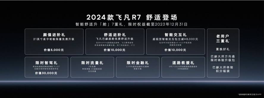 即日起截至2023年12月31日,下定新款R7还可享智能舒适升舱7重礼包,涵盖颜值进阶礼、舒适进阶礼、智能交互礼等。此外,为感恩老用户的厚爱,飞凡汽车推出了老用户三重福礼,包括置换新款R7的五万元限量现金置换礼、7777积分福袋礼,以及巴赫大师方向盘限时体验升级包。