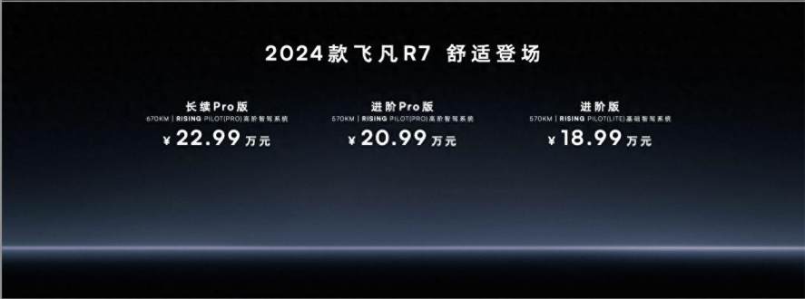 2023年11月17日,在广州国际汽车展览会上,智能舒适·中大型轿跑SUV—2024款飞凡R7正式上市。新车共推出3款车型,售价18.99-22.99万元,并限时赠送智能舒适升舱7重礼包。新款R7以129项整车改进,4大舒适产品价值点,刷新中大型轿跑SUV智能舒适体验。此外,智能舒适·中大型掀背电轿——飞凡F7都市版,同台上市,售价18.99万元。飞凡F7同步推出全新限时政策,更可同享五重礼遇,以超值进阶带来超冠军的价值体验,再次刷新20万级中大型电轿价值标杆。