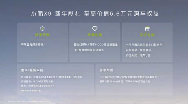 何小鹏在发布会提到,“小鹏X9牢牢锁定30-40万级区间的用户核心需求,以最具价值的配置级差,降低用户选择难度的同时,为用户提供更实用、更高性价比的选择”。为感恩用户的持续关注与坚定选择,小鹏X9还推出新年献礼,至高价值5.6万元购车权益,包括终身无忧、专属礼遇、交付礼盒等多重礼遇。