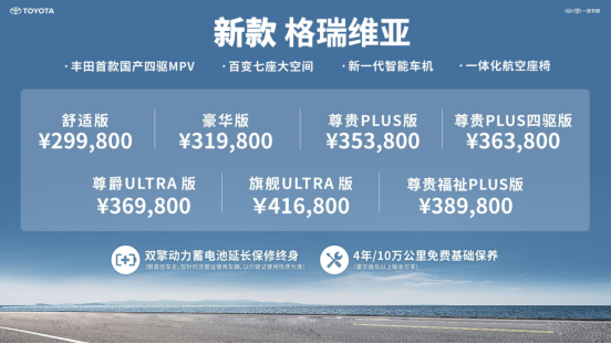 4月18日,丰田首款国产四驱MPV--新款格瑞维亚正式上市,新车共发布7款车型,售价为29.98万元-41.68万元。其中,尊贵PLUS版在现款基础上不仅再降3000元,还增加了价值万元的智能配置,包括最新一代车机系统,人性化的HUD抬头显示功能、12.3英寸全液晶仪表盘,并可以选装一体化航空座椅。尊贵PLUS四驱版售价仅比尊贵PLUS版上浮一万元,满足了用户既追求平稳舒适,又注重品质出行的诉求。此外,舒适版定价更是比现款车型售价直降1.6万元,首次进入30万元价格区间,让更多用户可以轻松拥抱高品质的大七座MPV,带上全家,满爱出发。 一汽丰田汽车销售有限公司副总经理王林虎表示,一汽丰田全面响应国家鼓励消费品以旧换新的号召,率先推出了20亿钜惠以旧焕新活动,覆盖全部主销车型,为用户创造最佳购车时机。同时,一汽丰田正在向全面高端化、全面智混化的方向发展,全面回应用户对高品质出行的价值诉求,为用户带来更愉悦的出行生活。新款格瑞维亚,就是一汽丰田首款焕新升级的高端旗舰级MPV,代表一汽丰田不断进取,满足用户需求的决心。 此次活动,著名作家冯唐作为特邀嘉宾来到直播现场,和观众共同探讨生活哲学与幸福真谛,并进一步解读了新款格瑞维亚在家庭生活中的价值与意义。 新款格瑞维亚搭载E-Four电子四驱系统、新一代智能车机系统,以及平替百万豪车的二排豪华座椅等焕新配置,拓展家庭出行半径的同时,为家人提供高品质乘坐享受,以实力承载美好生活。 丰田首款国产四驱MPV,带着家人去看更多的风景 MPV既然是为家庭出行服务,那么舒适和稳定性自然必不可少。在行驶过程中,如果能有一套四驱系统的加持,便能有效提高车辆在湿滑路面和过弯时的稳定性,为家人的乘坐舒适性和安全性增添一份保障。作为丰田首款国产四驱MPV,新款格瑞维亚此次升级亮点之一就是搭载了E-Four电子四驱系统,不论是在雨、雪天气出行,还是在复杂的弯道行驶,车辆都能轻松应对,让一家人在车内更安心、更踏实。 不仅如此,新款格瑞维亚的四驱系统与THSⅡ2.5L智能电混双擎系统高效协作,输出澎湃动力的同时,实现百公里仅6.13L的超低油耗,这一数据甚至远超行业中的两驱MPV,这意味着它不仅能为用户节省出行成本,在无需充电的情况下,一箱油可以跑1000多公里。 同时,在混合动力领域,丰田经历27年的发展,在全球积累了超2500万车主,且保持着电池安全0事故的纪录,是业界公认最成熟的电动化技术。在强大背书下,新款格瑞维亚经得住时间与里程的双重考验,将为用户带来全温域畅行无忧、安心无充电焦虑的出行体验。 新一代智能车机,打造便捷愉悦的出行时光 对于一家之主来说,选择MPV最注重的不止是大空间和品质感,在万物互联的智能时代,越来越多的用户希望车辆能够成为自己的智慧伙伴,给家人带来更好的出行体验。新款格瑞维亚首次搭载新一代智能车机系统,为用户带来更高效、更贴心的交互体验。 新一代智能车机系统采用高通8155芯片,算力提升4倍,反应更灵敏。语音交互支持聊天式连续对话,无需重复唤醒。车载版微信支持查看、接收、发送消息、拨打/接听微信语音通话、实时位置共享,再加上车机涵盖的多元常用小程序,为用户带来车机即手机的便捷体验。更人性化的导航服务可实现路书推荐、沿途天气查询、组队出游、实时对讲,不论是查路况、找队友,分分钟轻松解决。 值得一提的是,新一代智能车机系统支持CarPlay/CarLife/HiCar三大手机无线互联,不论用户使用的是什么品牌的手机,都能在新款格瑞维亚上收获优质的智能交互体验。车机系统同时支持个性化OTA升级,确保用户常用常新。 平替百万豪车的二排座椅,只为最在乎的人 走出家门,车则成为了自己与家人共聚的“第二情感空间”,所以说MPV是让全家链接的纽带。因此,要为在乎的人,选更好的车。为了提升家人乘坐的舒适度,新款格瑞维亚搭载了一体化航空座椅,采用超长滑轨,滑动最大范围可达816毫米,兼顾了舒适性与实用性。同时,座椅支持按摩功能,还可加装加热、通风功能,并带有电动腿托,不论是带家人长途旅行,亦或是携长辈出游,都能有效缓解疲劳感、提升舒适度。可选装的后排娱乐电视,可以让二、三排乘客更好的度过车内时光,尤其是带孩子出游,直接让小朋友实现“动画片自由”。 在空间方面,格瑞维亚还具备灵活的空间布局,可调整2座、3座、4座、5座、6座、7座,共6种座椅布局形式。同时,在车内7个座位都使用的情况下,后备箱容积达525L,可容纳3个28寸拉杆箱,最大容积可拓展至2112L,让每一位家庭成员找到舒适专属空间的同时,还能把一家人的快乐和幸福装得“满满当当”。 在MPV领域,凭借34年的深厚积淀,丰田以众多卓越产品赢得用户信赖,在业界处于绝对领先地位。格瑞维亚传承丰田MPV世家基因,更懂用户需求,稳定性、舒适性、安全性有口皆碑。截至目前,格瑞维亚累积销量超过了6万台,月度销量最高达6235台,今年一季度销量更是同比增长17%,是MPV领域中绝对的畅销车型。新款格瑞维亚,将全面回应新时代家庭用户多元化的出行需求,为用户带来更愉悦的出行体验。 值得一提的是,新款格瑞维亚为更追求豪华高品质的用户准备了丰富用品,包括:迎宾灯、便利的车载冰箱,后排娱乐电视等配置,让幸福指数再提升一个档次。同时,格瑞维亚全系提供智能电混双擎动力电池保修终身;另外,