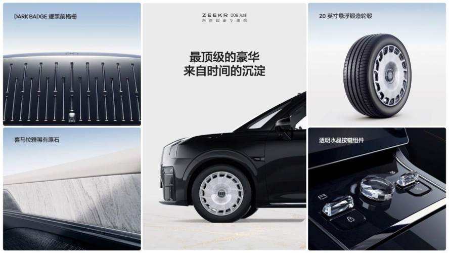 最顶级的豪华,来自时间的沉淀。极氪将来自喜马拉雅山脉南麓的天然大理石,作为原厂定制内饰材质,经过纯手工打磨抛光,镶嵌至后排座舱,赋予每一台极氪009光辉,近5000万年时间沉淀的独特纹路;让新能源时代最有魅力的前脸更加极致,极氪009 光辉的DARK BADGE耀黑前格栅,是全球面积最大的金属前格栅,采用与劳斯莱斯相同工艺,经由顶级工匠,以一万目的镜面级标准,耗时30小时手工打磨完成;每个20英寸悬浮锻造轮毂,都要经过20个小时的手工打磨,呈现镜面效果后,再用激光雕刻工艺在轮毂表面雕刻出240道明暗变化的花纹,无论动静均可做到最精湛的光线反射效果。因此,每一辆极氪009光辉,都是时间创造出的,独一无二的杰作。