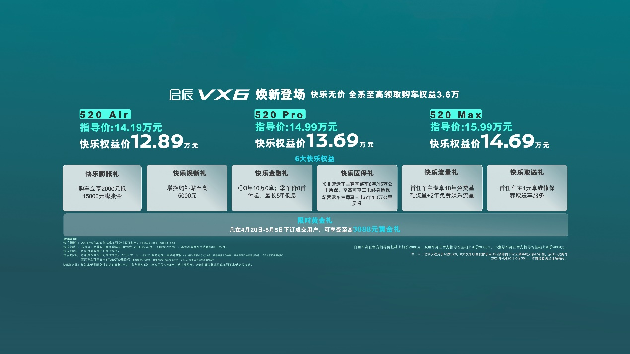 Max版,指导价为15.99万元,快乐权益价为14.69万元。启辰VX6 520