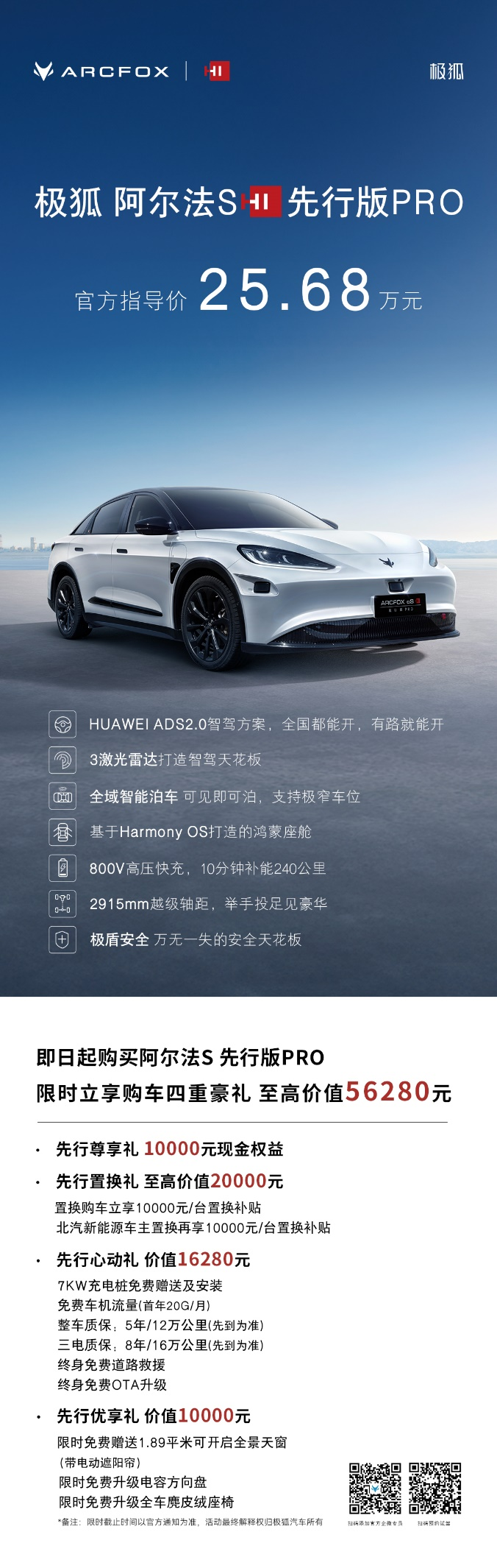 4月25日,极狐阿尔法S先行版PRO在北京车展正式上市,官方指导售价为25.68万元。同时,还限时推出了四重豪礼,综合优惠近56280元,其中现金优惠1万元,这意味着只需24.68万元即可拥有高阶智能豪华纯电轿车,更有置换车主享最高20000元优惠,最低可达22.68万。相较市面上其他带激光雷达的车型基本都在26万以上,这款车可以称之为 “最具产品竞争力的高阶智驾产品”。