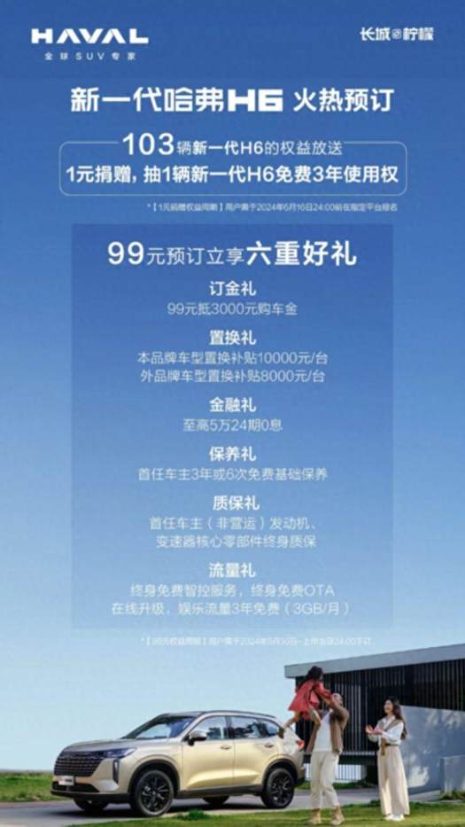 在2024年5月30日晚,哈弗汽车宣布新一代哈弗H6正式开启预售,并推出了极具吸引力的预售权益。消费者仅需支付99元预订金即可抵扣3000元购车基金等优惠政策,更可享受订金礼、置换礼、金融礼、保养礼、质保礼、流量礼等六重好礼。此外,哈弗品牌还推出了一项公益活动,消费者可通过1元捐赠参与抽奖,有机会获得新一代哈弗H6 Hi4版免费3年使用权,将在新一代哈弗H6的上市发布会上,从捐赠用户名单中,现场直播抽取103名幸运用户并进行公布,捐赠资金全部捐献给中国红十字会;所有人都能参与,没有任何的门槛。权益即日起截止至2024年6月16日24:00。