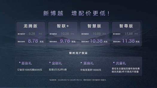 吉利新博越此次上市,不仅全系指导价下调7000元,更有1000元订金抵6000元购车金的限时权益,享受权益后,限时先享价低至8.78万元起。新博越龙腾版:金融礼享4.5万2年0息,置换礼享8000元置换补贴;配置升级,价格更优,诚意满满的举措,让用户享受到前所未有的高品价比,所有用户2024年7月31日前都享受以上购车权益。