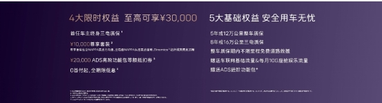 与此同时,在2024年10月31日前(含),下定用户可享受4大限时权益,至高可享30000元。包括首任车主终身三电质保、10000元尊享套装、20000元ADS高阶功能包等额抵扣券、0首付起,全期限低息等。
