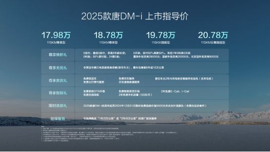 此次,2025款唐DM-i共推出4款车型,售价17.98万~20.78万元。同时,比亚迪为用户准备了包括“尊享焕新礼、尊享无忧礼、尊享贵宾礼、尊享智联礼、限时选装礼、延保服务”六重购车礼遇。