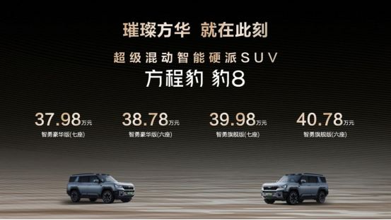 11月12日,比亚迪华为联合发布方程豹豹8上市,共发布4个款型,其中智勇旗舰六座版40.78万元、智勇旗舰七座版39.98万元、智勇豪华六座版38.78万元、智勇豪华七座版37.98万元。作为比亚迪30周年的旗舰之作,比亚迪华为首次联合开创的智能硬派,豹8定义了国货旗舰的顶级价值,开创了自己的价值公式——8=4x(1+1)。1台豹8等于 4大王牌科技,乘以1套全家舒享豪华配置加1个非承载式硬派车身,以“智勇双全”的非凡实力,开启全球智能硬派新时代。