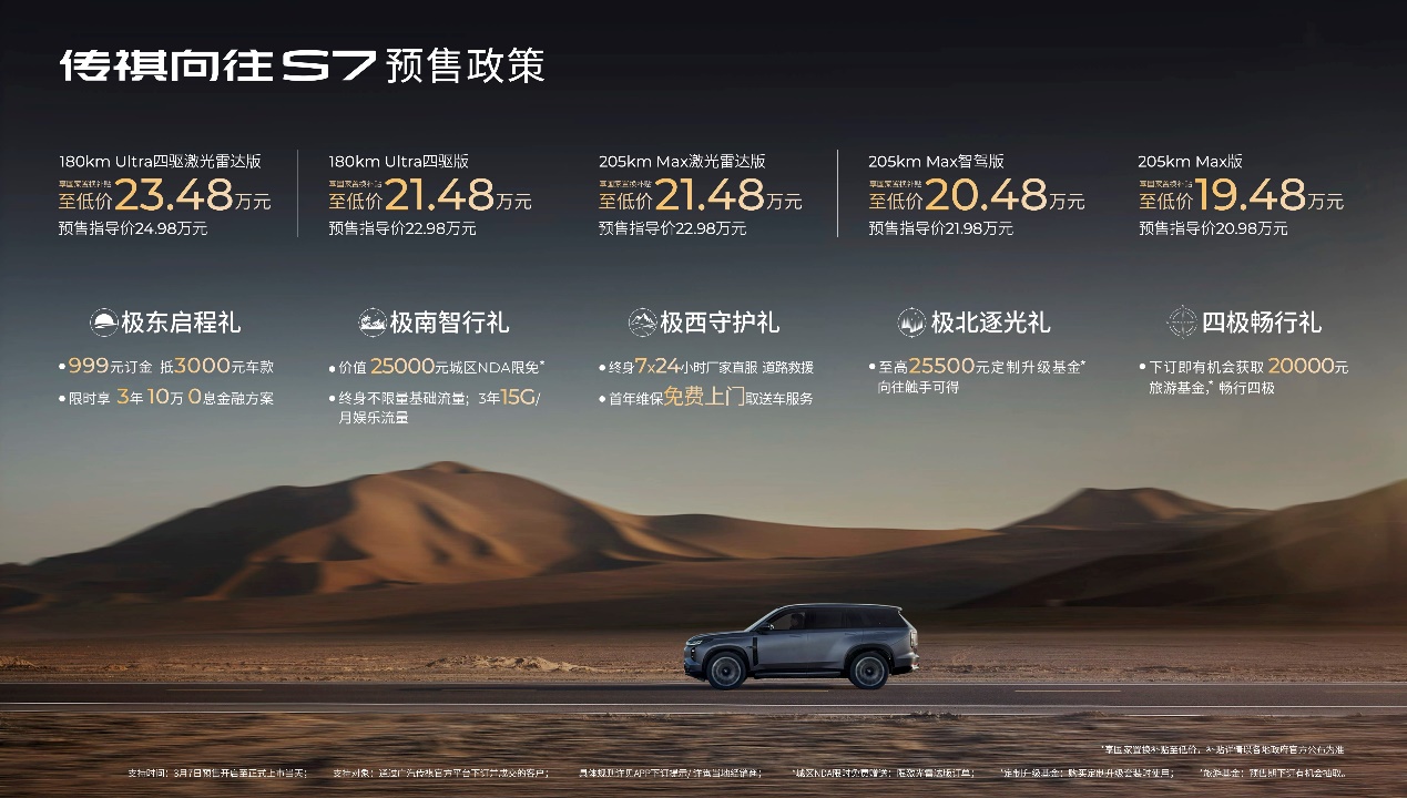 可以说,传祺向往S7在设计、技术、服务各方面,都实现了超预期经营。在发布会上,作为压轴环节,传祺向往S7正式揭晓了其预售价格,涵盖两大系列共五大车型版本,价格区间为20.98万至24.98万元。享受国家补贴后,价格低至19.48万至23.48万元,意味着仅需不到20万元,就能轻松拥有传祺向往S7。此外,传祺向往S7在预售期间还推出了五重超级预售权益。登录广汽传祺APP即可下订,越早下订,越早享受。