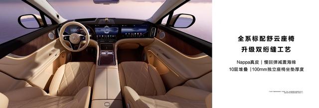 问界M9全系标配舒云座椅,采用优质Nappa真皮,升级双绗缝工艺,奢适触感与豪华质感相得益彰。主驾座椅升级电动可伸缩坐垫,大五座二排可选奢享零重力座椅套装[9],新增物理按键,支持一键即享,享六座主驾二排座椅升级电动腿托,坐拥奢适舒享体验。