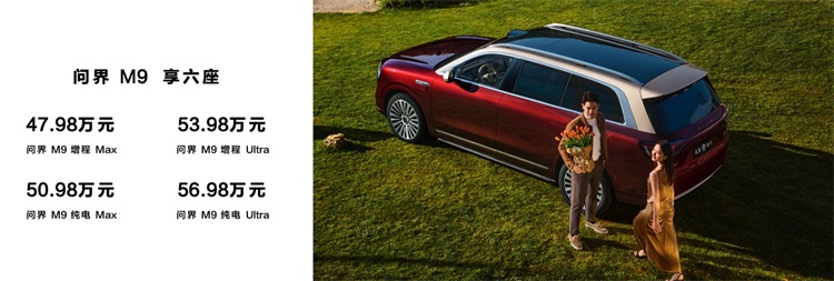 问界M9建议零售价如下:问界M9增程Max五座版46.98万元起、问界M9增程Ultra五座版51.98万元起、问界M9纯电Ultra五座版54.98万元起。问界M9增程Max六座版47.98万元起、问界M9增程Ultra六座版53.98万元起、问界M9纯电Max六座版50.98万元起、问界M9纯电Ultra六座版56.98万元起。