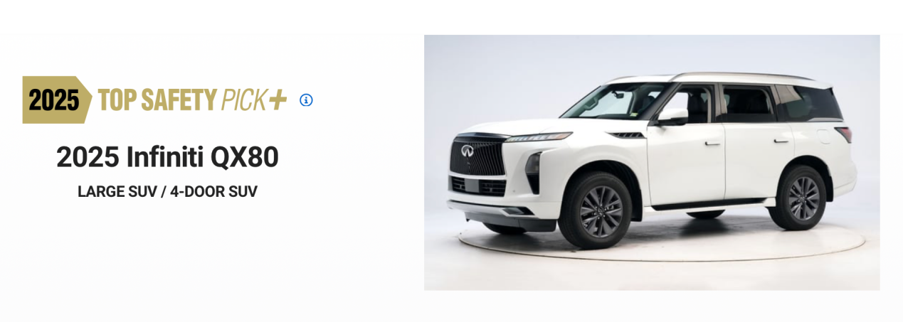 以安全为豪华的最大底线,QX80打造了超高强度车身,并搭载ProPILOT智能驾驶辅助系统、底盘透视影像系统等多维智能科技,荣获2025年度IIHS美国公路安全保险协会“TOP SAFETY PICK+”最高安全评级 。