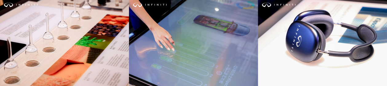 展台中央区域采用了超大面积的瀑布式连屏,带来流光溢彩的沉浸式光影,与展车交映生辉,令人一见倾心。同时,英菲尼迪联合法国个性化香氛定制品牌——Maison 21G Paris,打造品牌香氛体验区,精妙调香沁人心脾;联合Klipsch杰士音响打造品牌声音体验区,澎湃音效令人沉醉;更有品牌元素定制的点心和饮品,色味俱佳撩动味蕾。