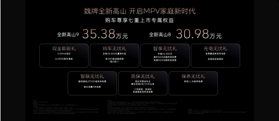 5月13日,以“开启MPV家庭新时代”为主题的魏牌全新高山上市发布会在保定圆满举行。此次发布会正式推出全新高山8/9两款车型,通过打造“有品位的家、舒适的家、安全的家、智能的家、健康的家”五大价值场景,重新界定了家庭 MPV 行业标准。此外,发布会正式公布了全新高山8/9最终售价,其中,全新高山8官方指导价30.98万元,全新高山9官方指导价35.38万元。